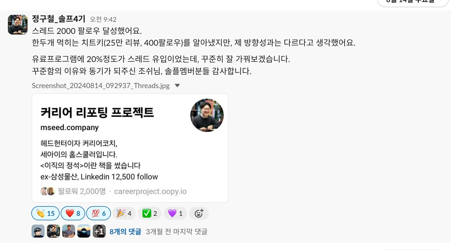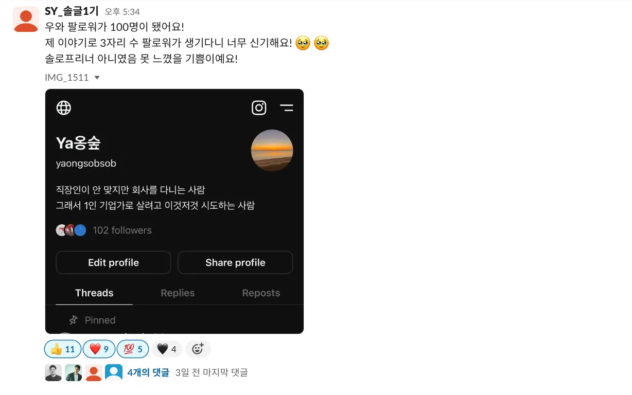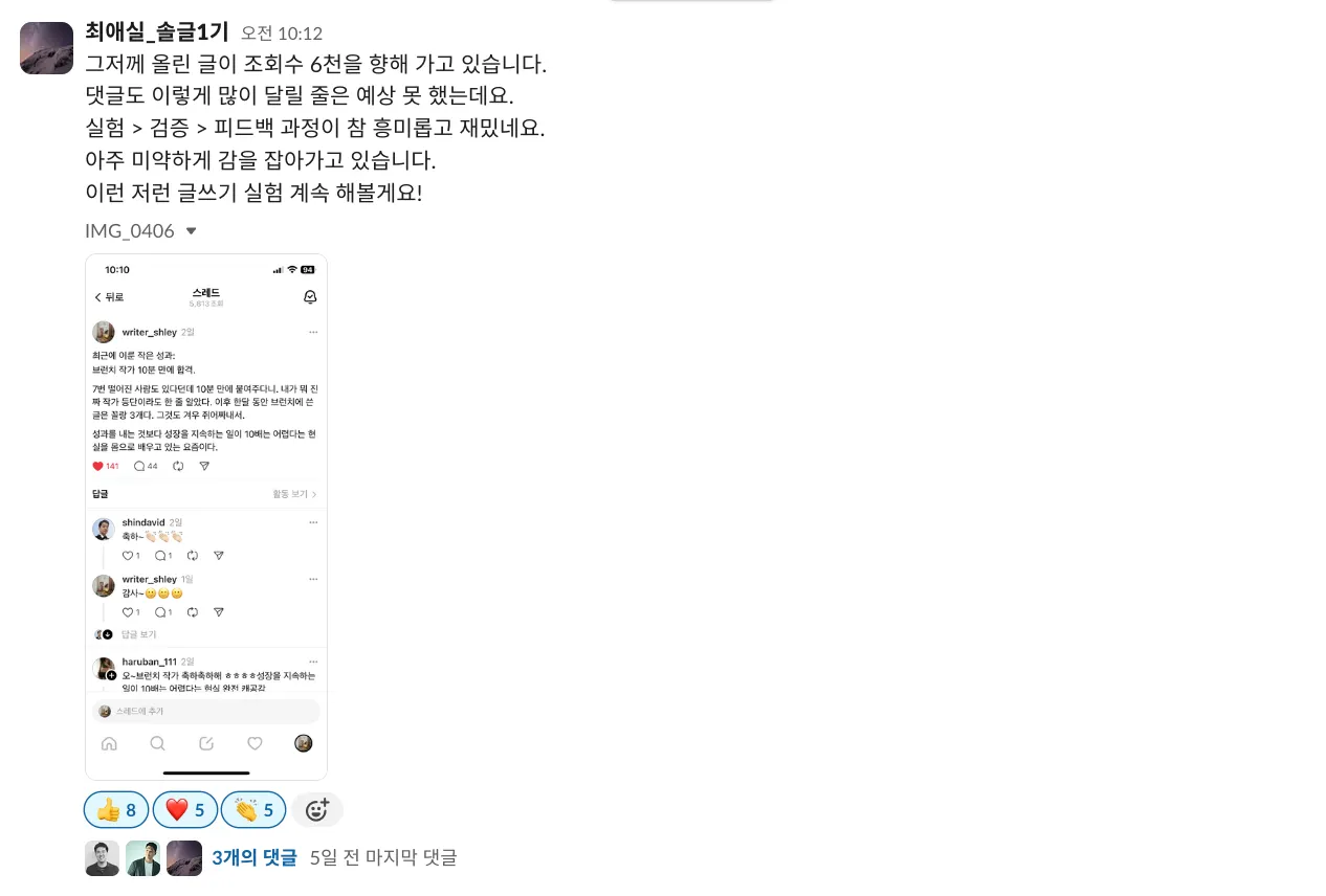 매일 소셜미디어(스레드 등)에 400자 이내의 글을 써요.
