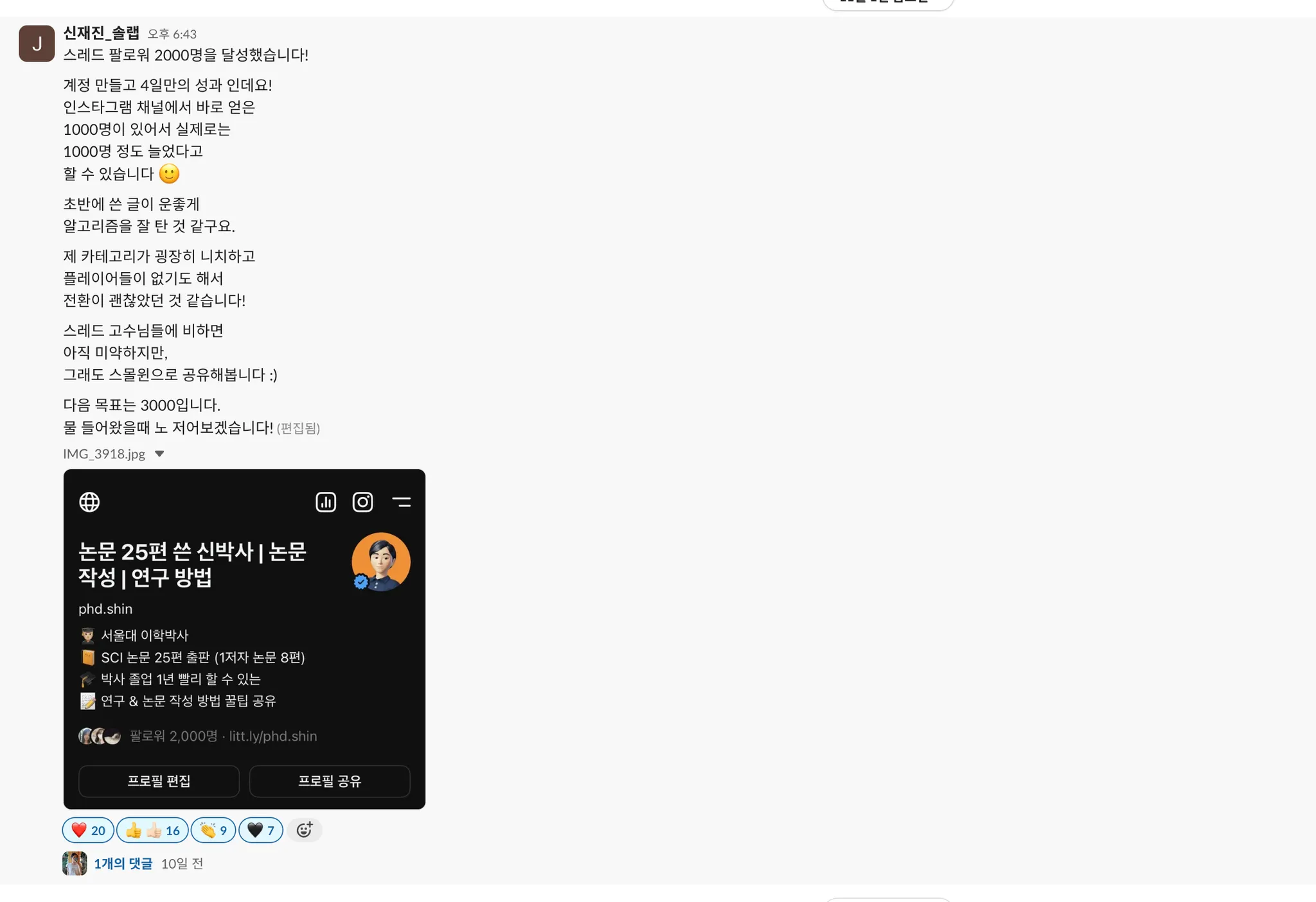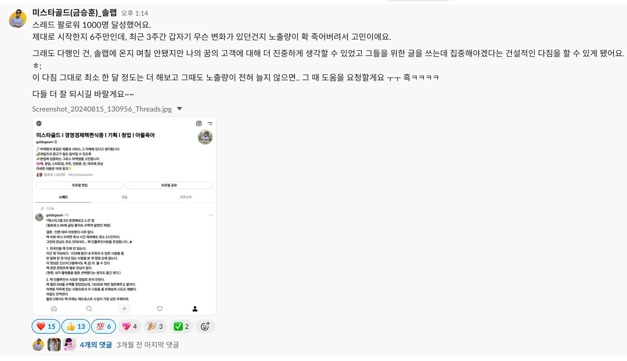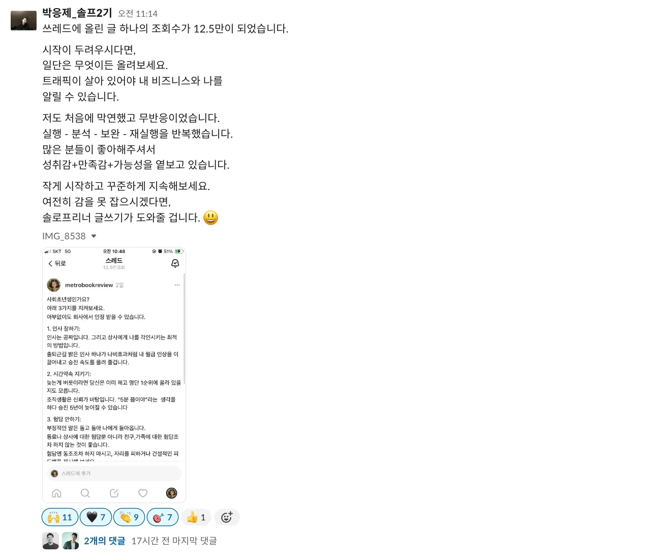 매일 소셜미디어(스레드 등)에 400자 이내의 글을 써요.