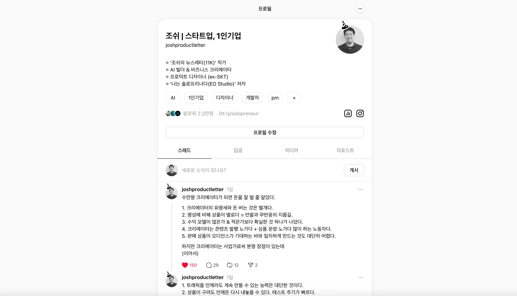 매일 소셜미디어(스레드 등)에 400자 이내의 글을 써요.